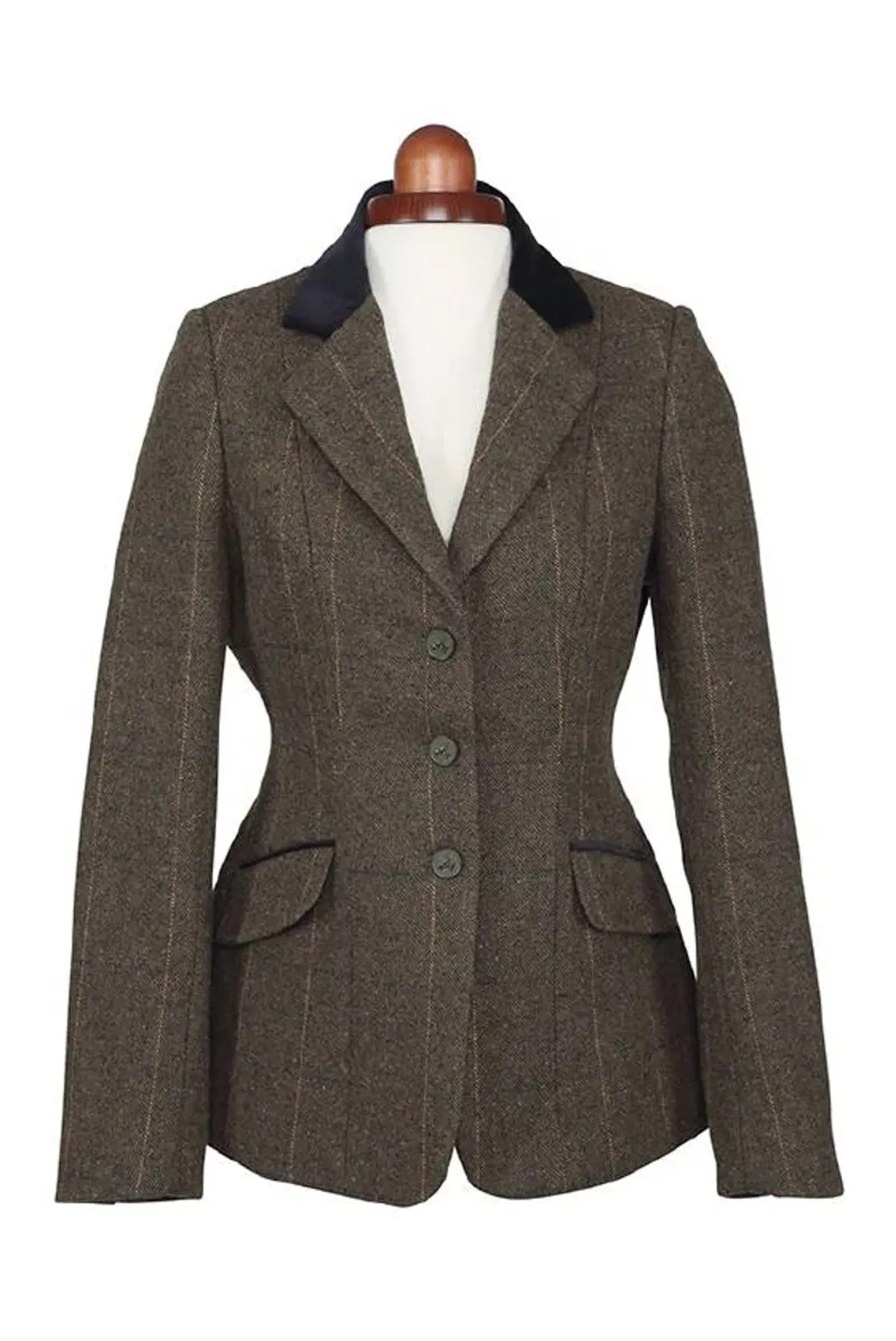A timeless classic, the Aubrion Saratoga jacket is cut with a flattering modern contour fit, and tailored for free movement in the saddle. Attractive wool rich tweed cloth is complemented by velvet trims at the revere notch collar and pocket flaps, and elegantly finished with a full satin lining. Suitable for a range of disciplines from showing, competition and countryside pursuits. Style detail: wool rich tweed cloth, classic fit, velvet trims, fully lined, 3 button front fastening, button detail at the cuff and back vents, two flap pockets, full satin lining.