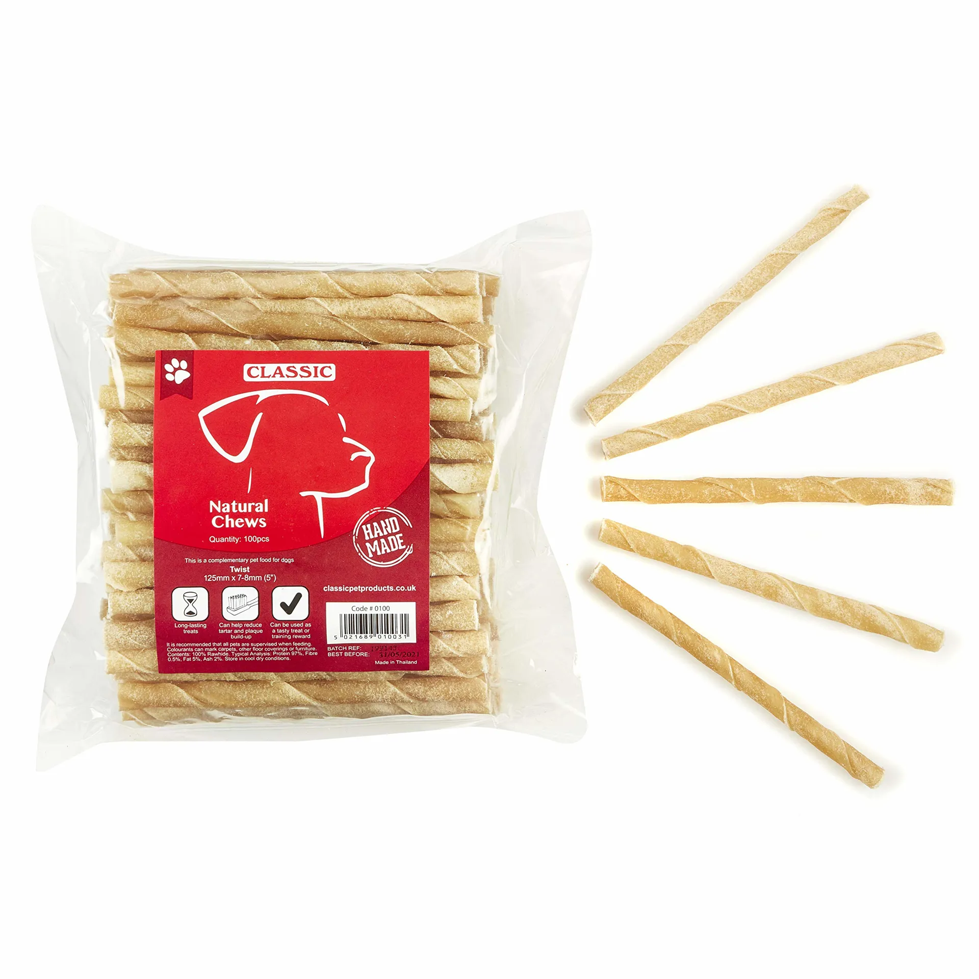 Analytical Constituents:Protein 97%, Fat 5%, Fibre 0.5%, Ash 2%Clean, fresh drinking water should always be available. Supervise your dog when giving them the treat.